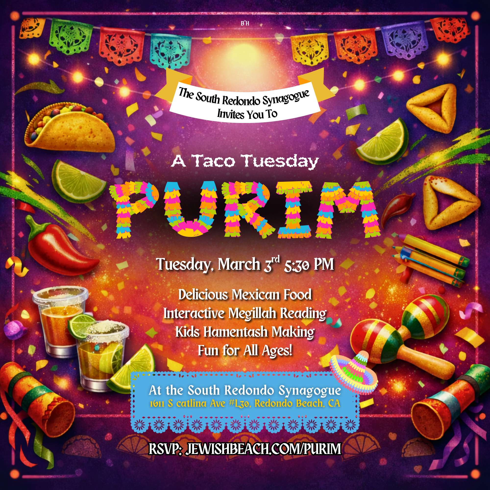 Enjoy delicious Mexican food, joyful energy, an amazing atmosphere, and hear the Megillah as we celebrate Purim - Taco Tuesday style!